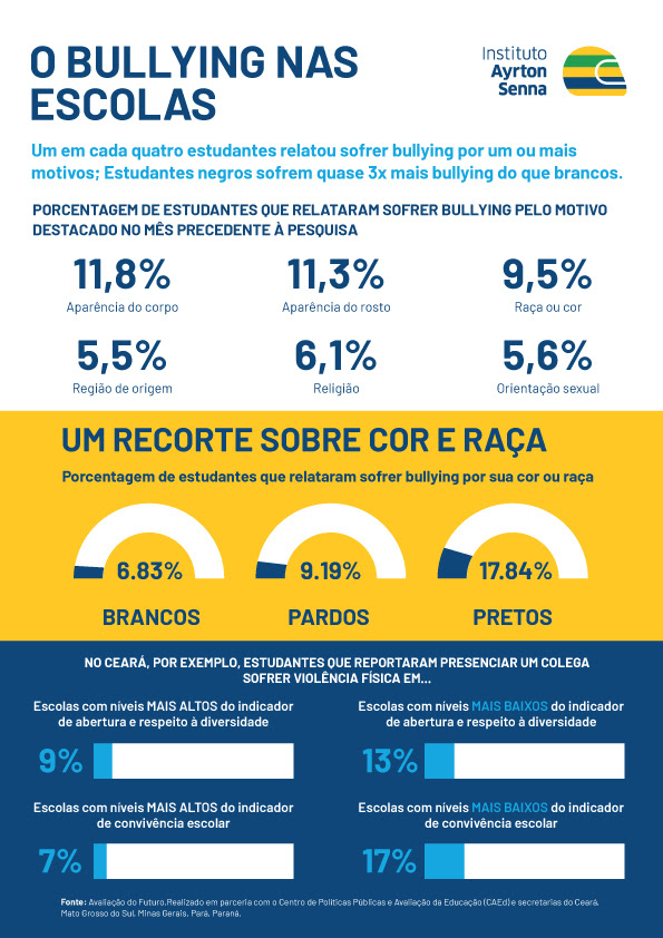 Um em cada quatro estudantes relatou sofrer bullying por um ou mais motivos no período de 30 dias anteriores à avaliação. Os principais são aparência do corpo (11,8%), aparência do rosto (11,3%), raça ou cor (9,5%), religião (6,1%), orientação sexual (5,6%) e região de origem (5,5%). Em relação aos estudantes que relatam sofre bullying por conta de cor ou raça, a desigualdade entre pretos e pardos é evidente: brancos (6,83%), pardos (9,19%) e pretos (17,84%). A Avaliação do Futuro ouviu cerca de 89 mil estudantes do Ensino Médio.